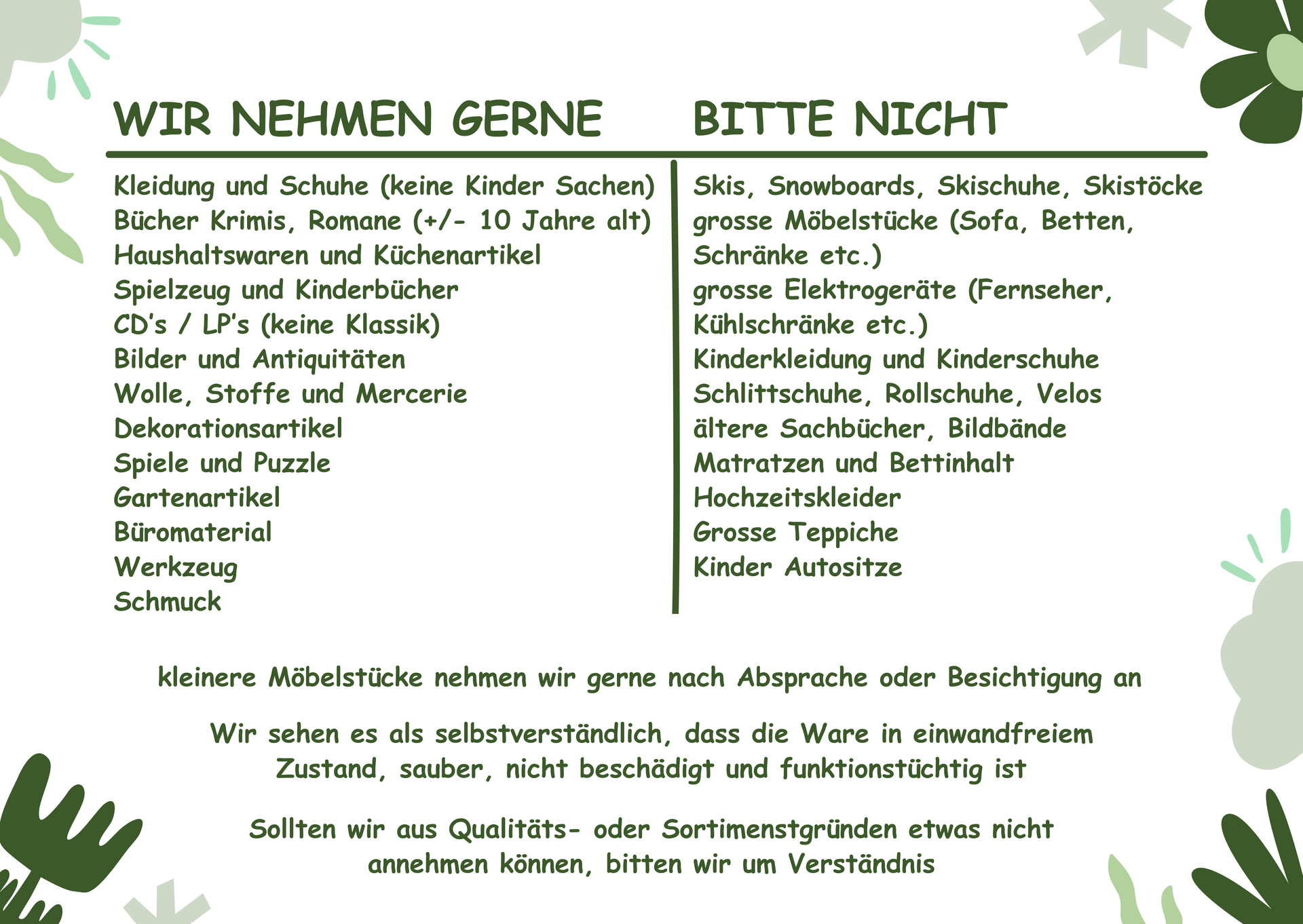 Aus Platzgründen können keine grossen Möbel wie Wohnwände, Polstergruppen, Betten etc. angenommen werden. Kleinere Möbelstücke nehmen wir gerne nach Absprache oder Besichtigung entgegen.